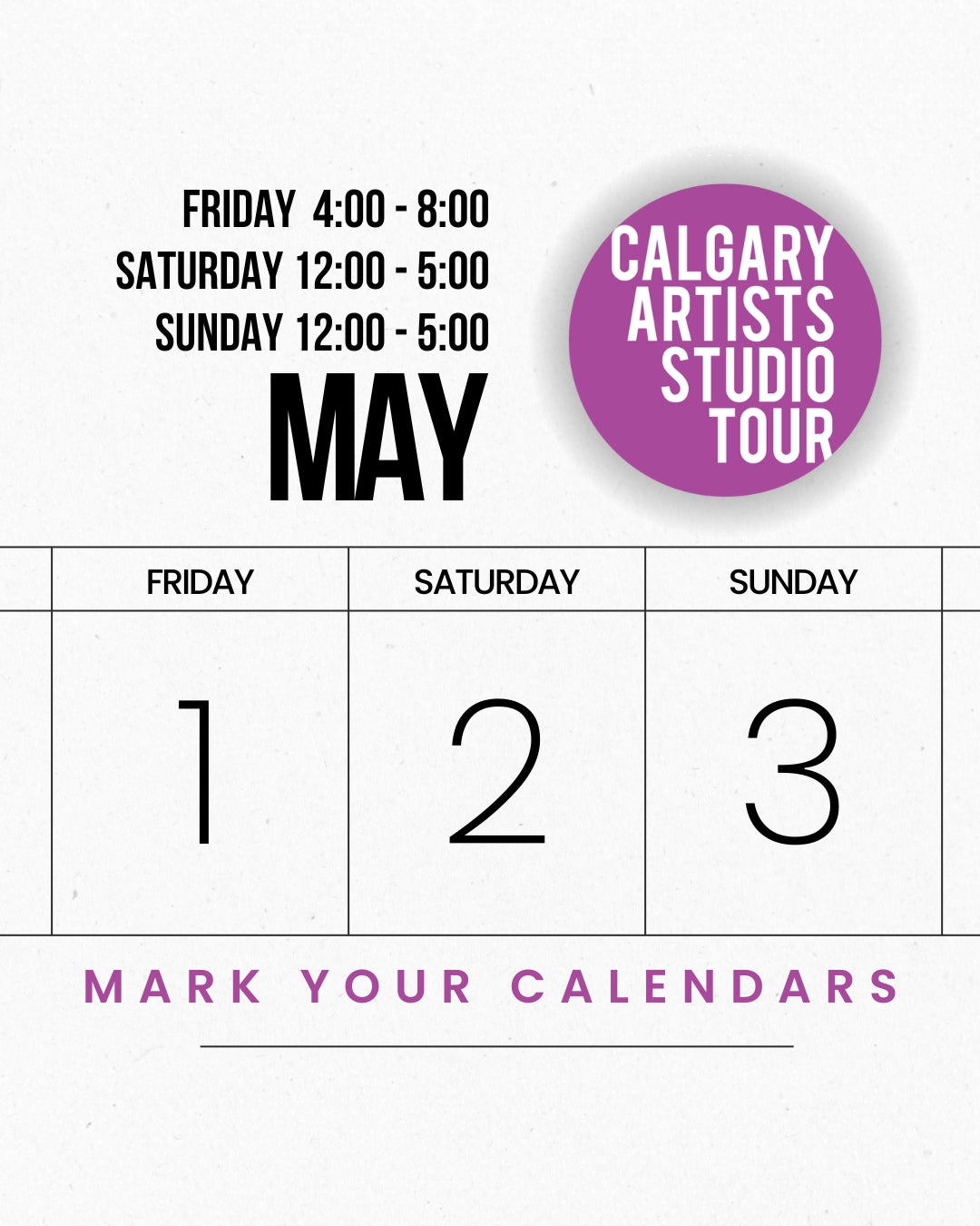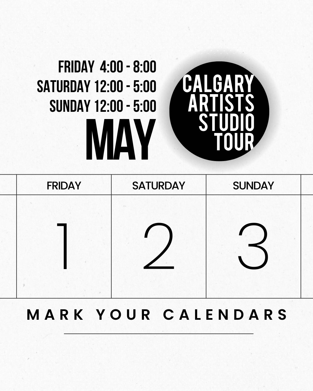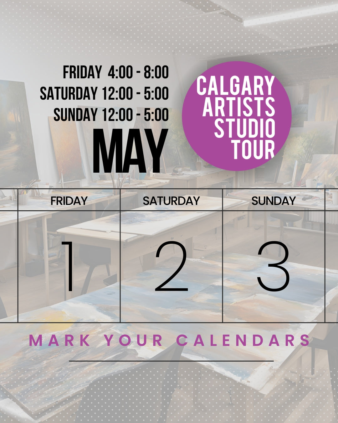 🎨✨ Mark your calendars for the Calgary Artist Studio Tour! 🗓️ Join us from May 1st to 3rd for a weekend of creativity and inspiration!