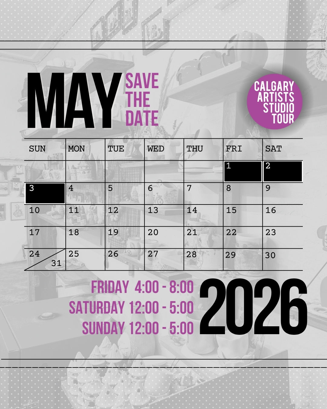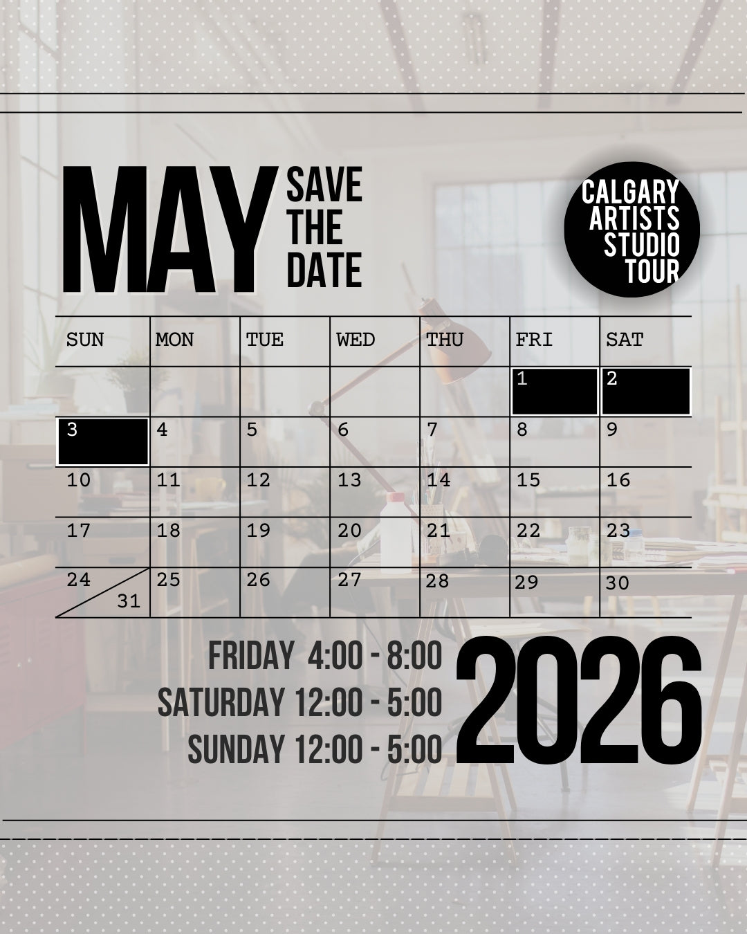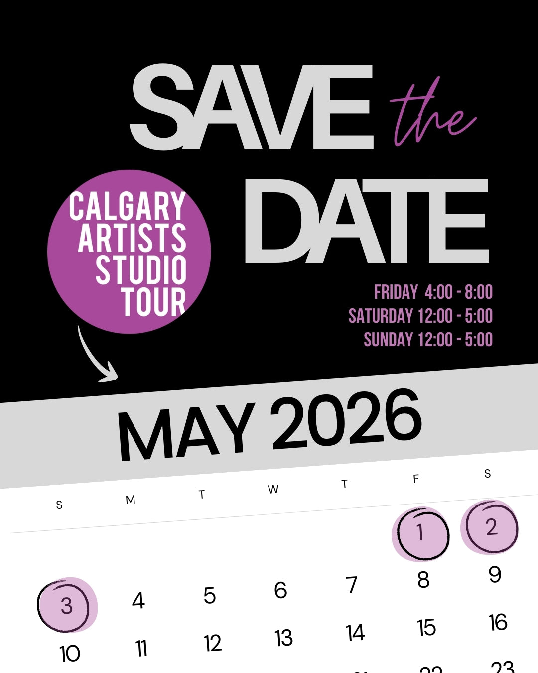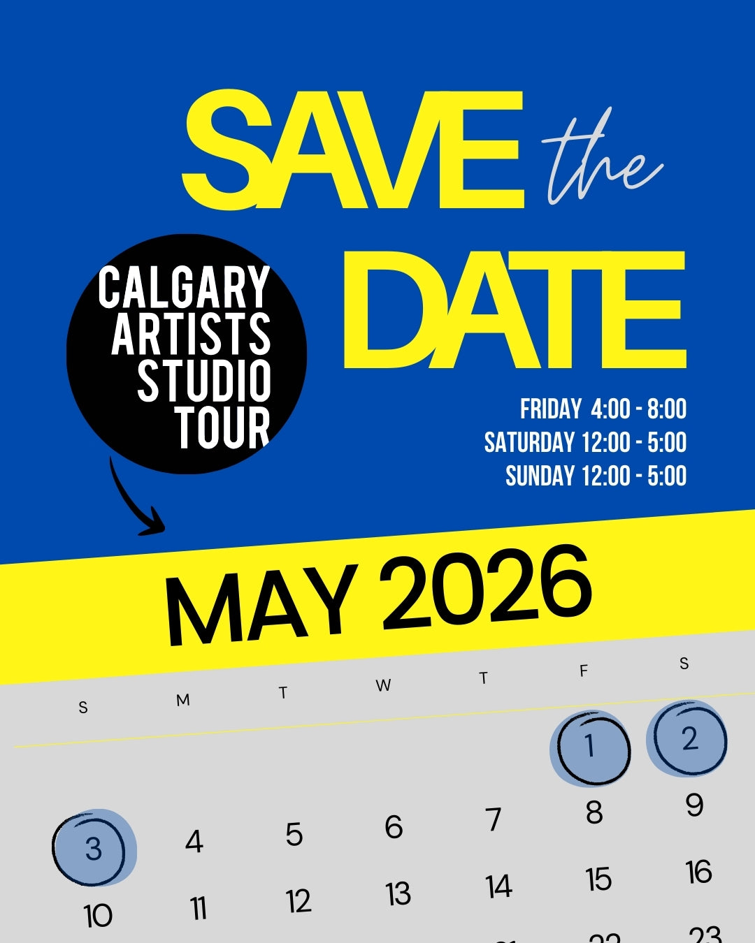 Save the date and stay tuned for more details! 🎉🎨 #CALGARYARTISTSSTUDIOTOUR #CAST2026 #YYCEVENTS #YYCNOW #YYCARTISTS